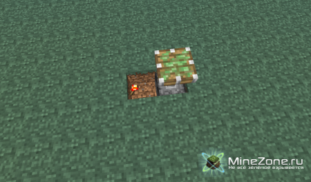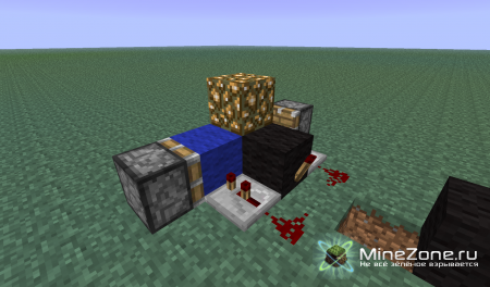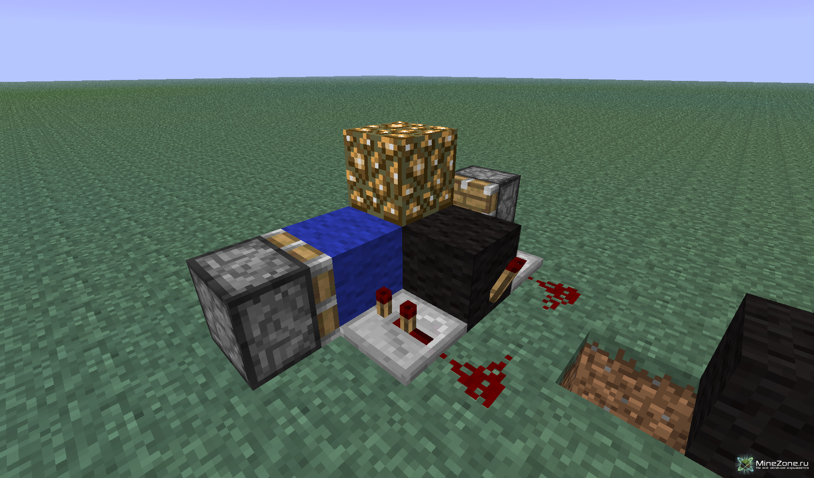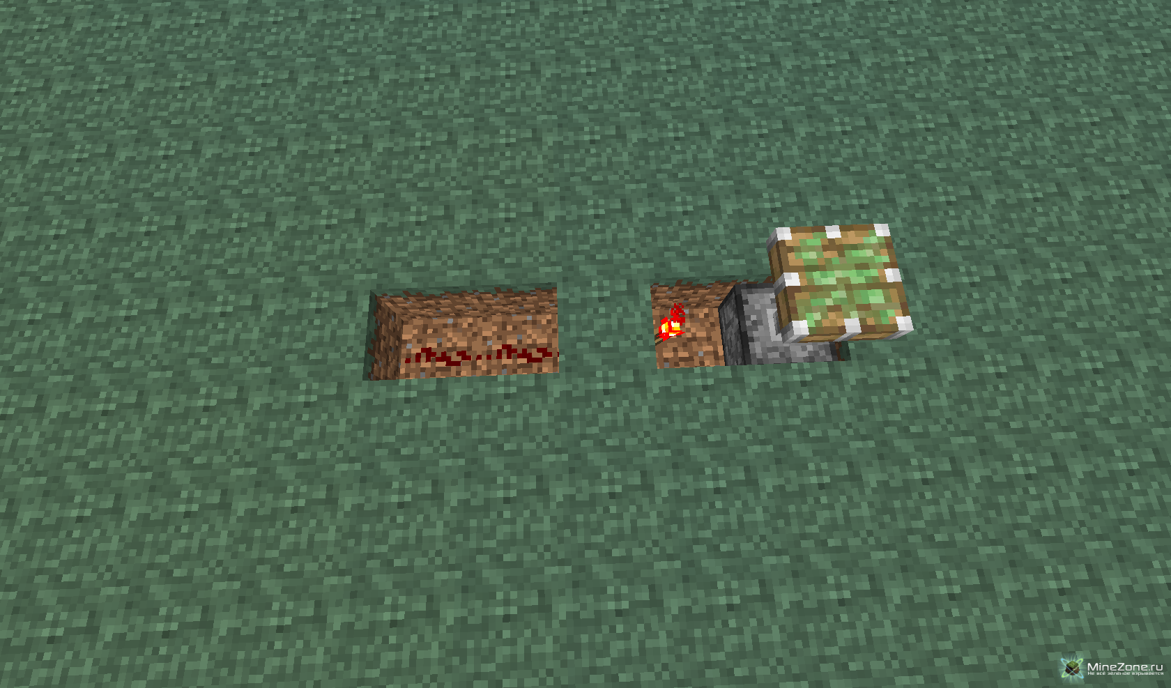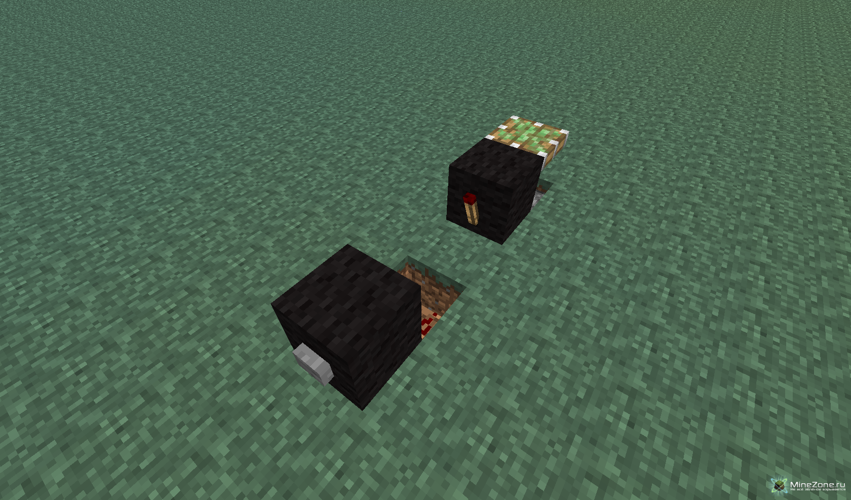 1. Выкапываем ямку 2x1 и ставим липкий поршень, напротив него красный факел. Делаем всё, как показано на рисунке: