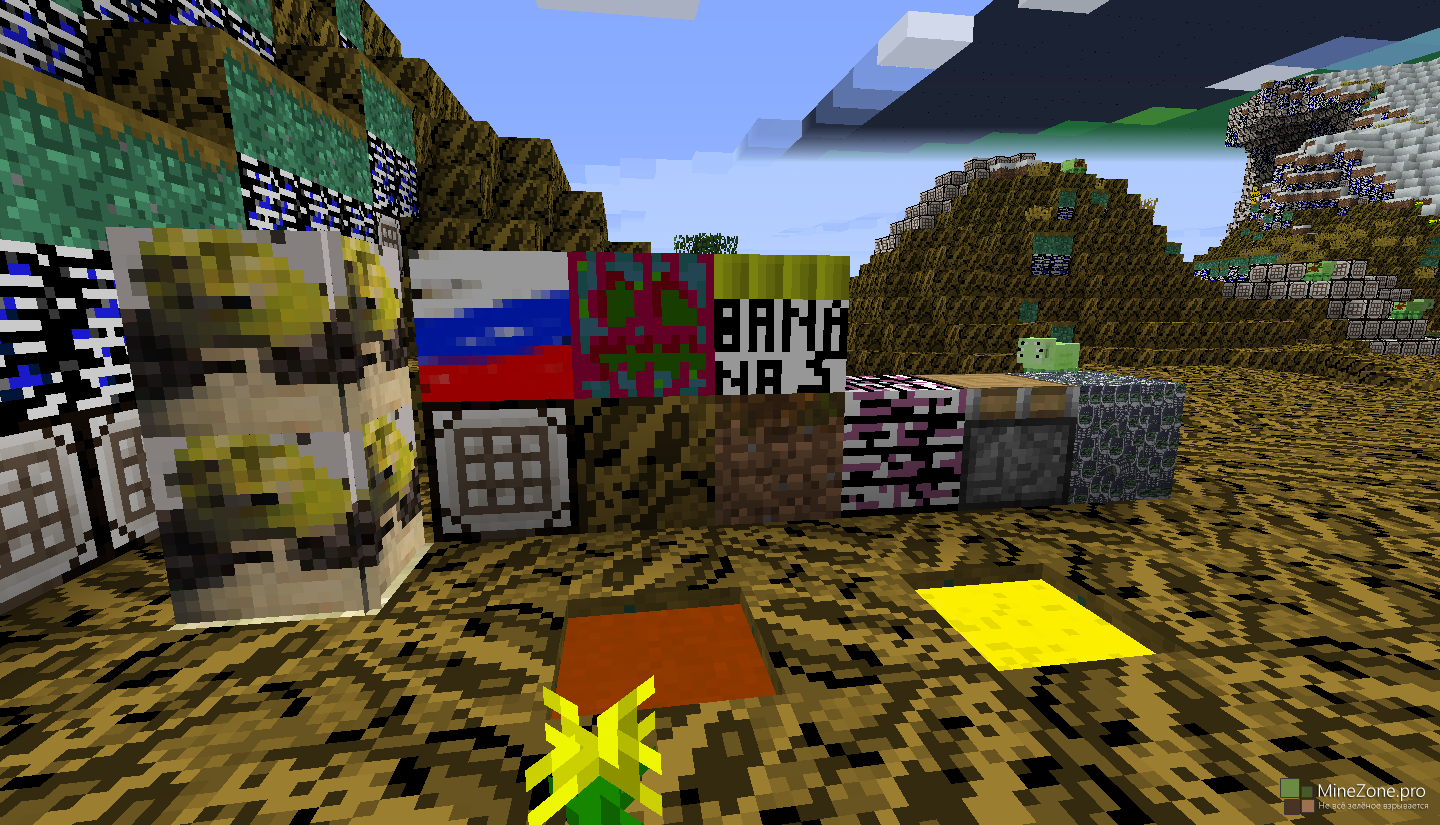 Кактус, Верхний ряд: Верстак, тыква, динамит. Нижний ряд: Камень, Трава, Подзол (текстура изменена вверху), доски, дуб, бедрок.