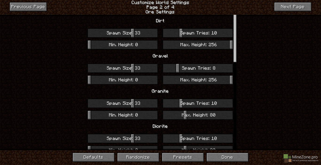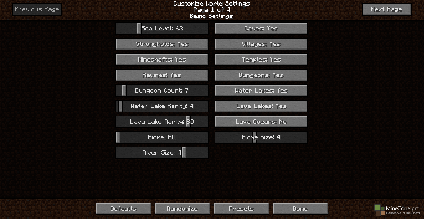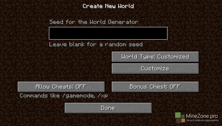 - Новая настраиваемая система генерации мира (Создать новый мир => Больше опций генерации мира => Тип мира: Индивидуальный);