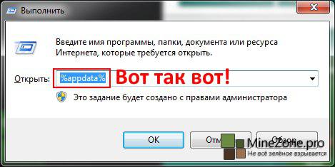 1. Для этого нажимаем win+R, в появившемся окошке будет поле, туда вбиваем %appdata%, жмякаем открыть.
