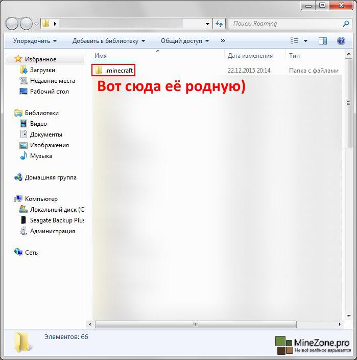 2. И скидываем в открывшуюся директорию папку из архива, а именно ".minecraft"