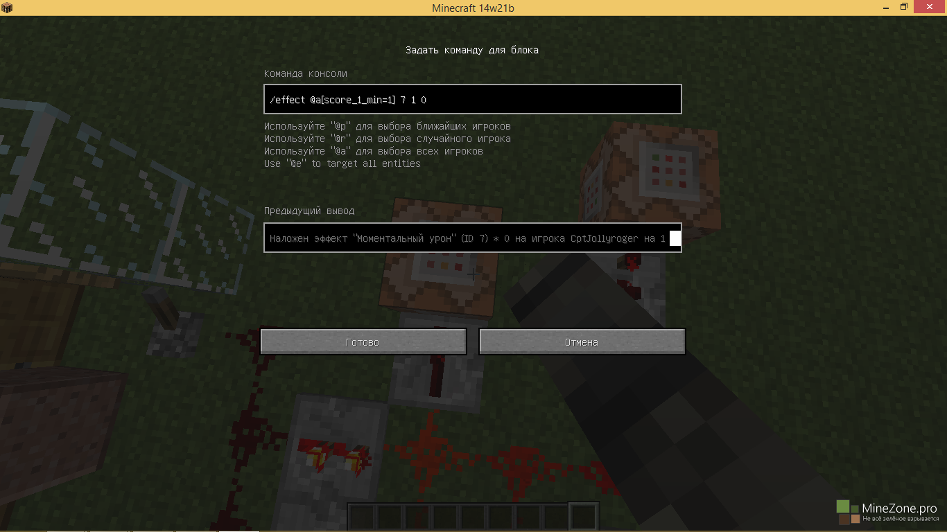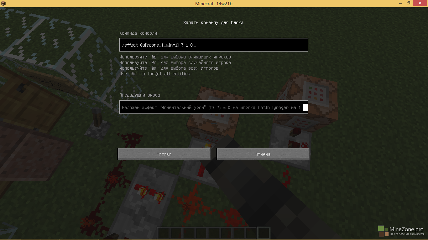 (/effect @a[score_1_min=1] 7 1 5) - Подключаем к замыканию командный блок, который будет обнулять Scoreboard (/scoreboard set @a 1 0)
