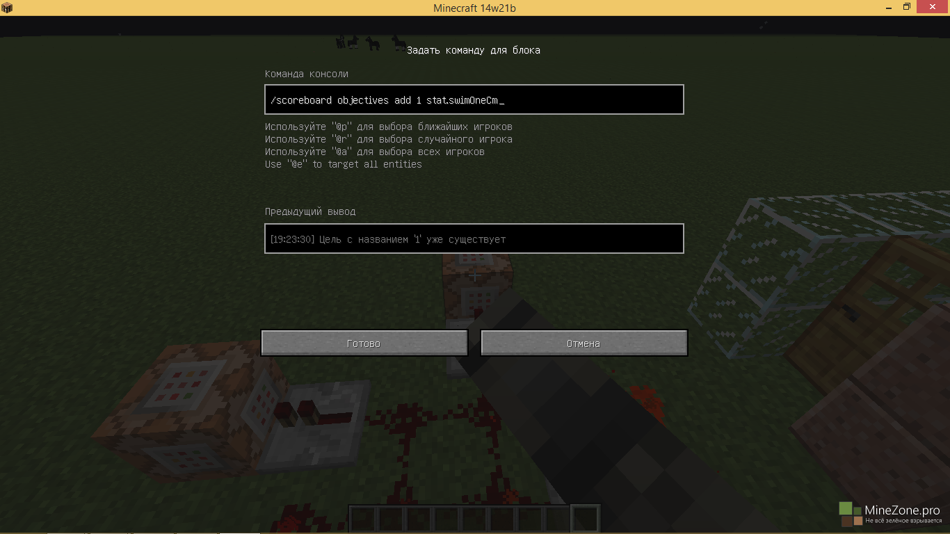 - Так же и тот, что будет его добавлять и удалять с подключеным повторителем с задержкой (/scoreboard objectives add 1 stat.swimOneCm) (/scoreboard objectives remove 1)