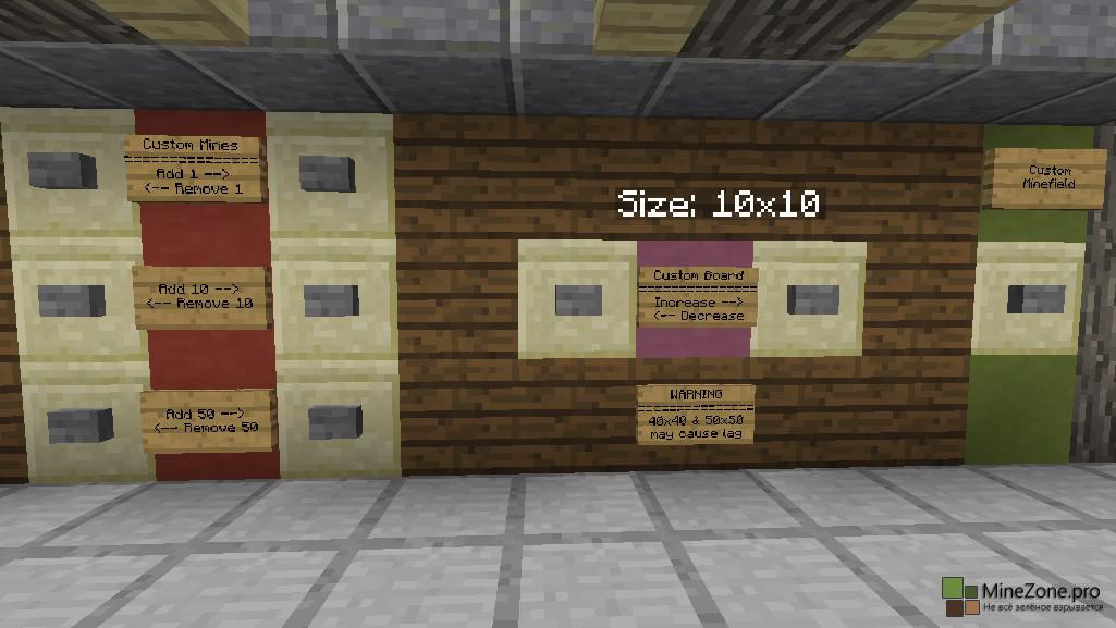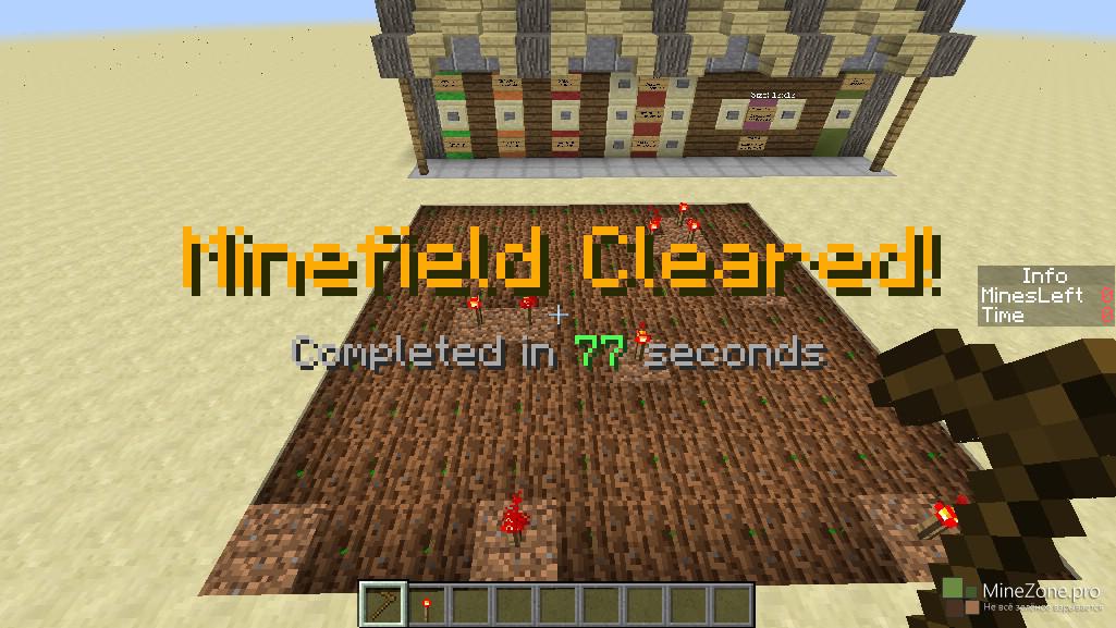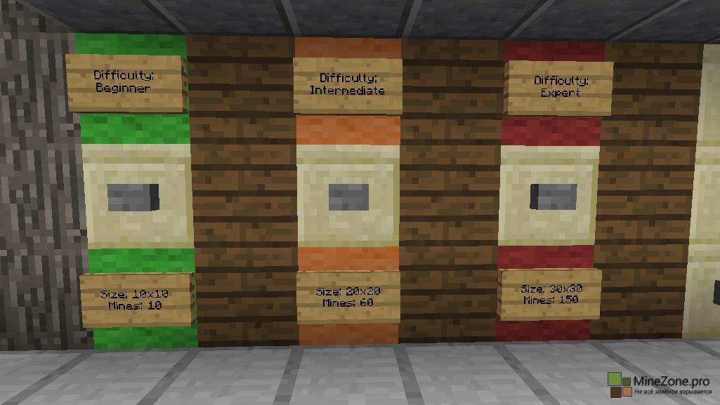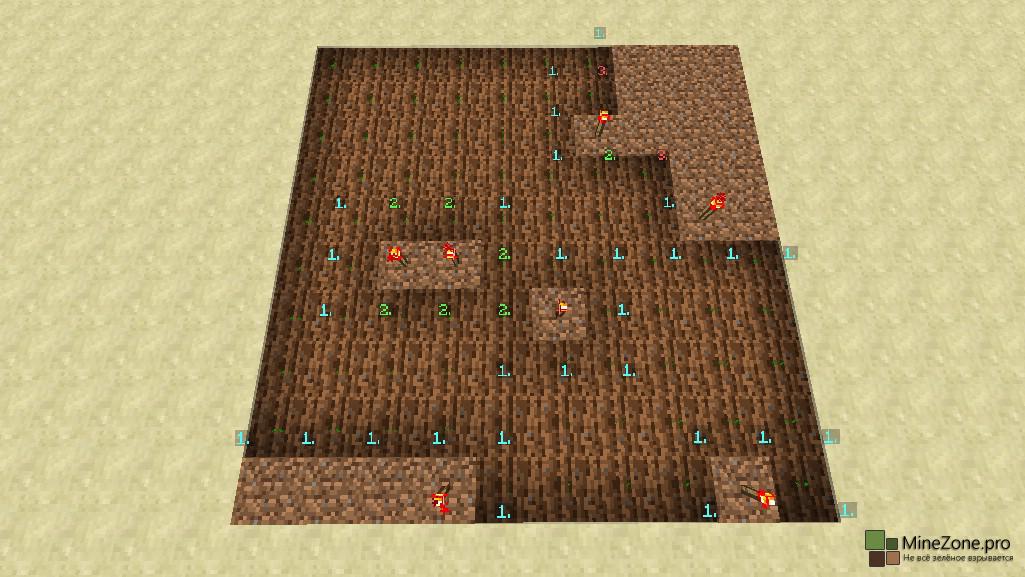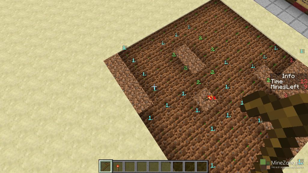Кликаем на нужную сложность и начинаем играть! Справа появляется счётчик времени и количество необезвреженных мин. Чтобы начать игру, кликните мотыгой ПКМ по любому блоку земли. Стартует отсчёт времени, а над выбранным блоком появится цифра, обозначающая количество мин в радиусе одной клетки, то есть всё, как в сапёре. Красными факелами помечаем мины. Так же существует возможность создания собственных полей для игры