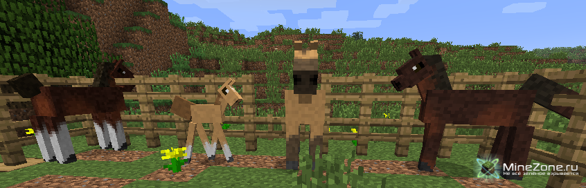 Информация:обычно лошади спавнятся на открытых лесах и равнинах от 5 до 10 особей.Не делайте резких движений, так как это может напугать лошадь и настроить ее против вас. Запомните в мире спавнятся обычные дикие лошади, они превращаются в породу только после влияния на них определенного предмета!