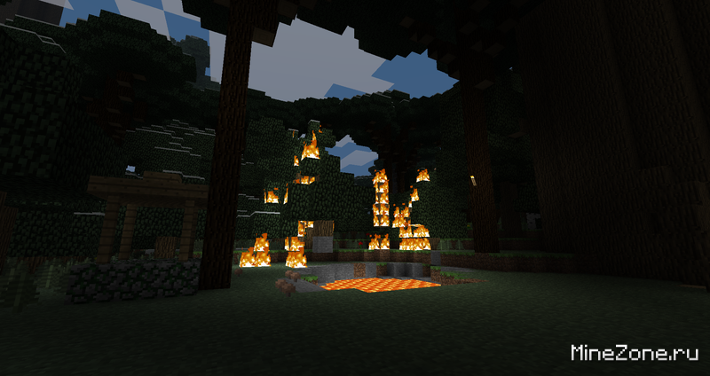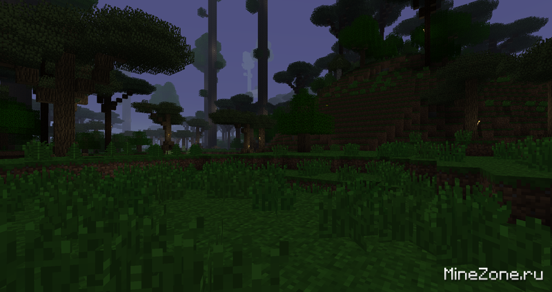 В лесу всегда сумерки, также огромные деревья закрывают свет, только факелы на деревьях немного освещают лес.