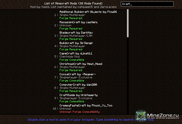 Также под каждым модом указано, для какого режима этот мод(SSP или SMP) и его совместимость с загрузчиком Minecraft Forge или необходимость в нем.