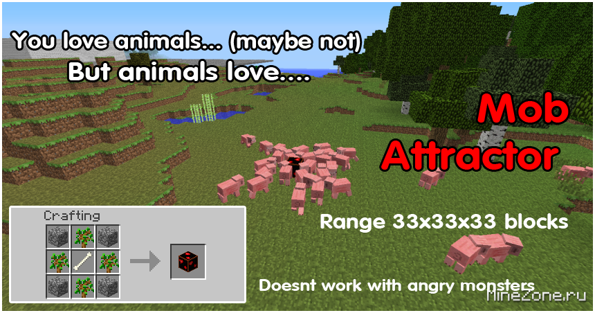 Не привлекает агресивных мобов. Область действия 33х33х33.