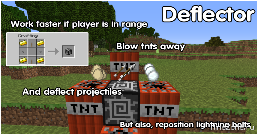 Отражает снаряды (стрелы, яйца и снежки), отражает молнии, отбрасывает динамиты, стоящие рядом.