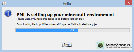 - Запустите Ваш MineCraft, далее Forge создаст папки mods и coremods, а также установит сам Forge Mod Loader (FML). А Вы увидите следующее окошко: