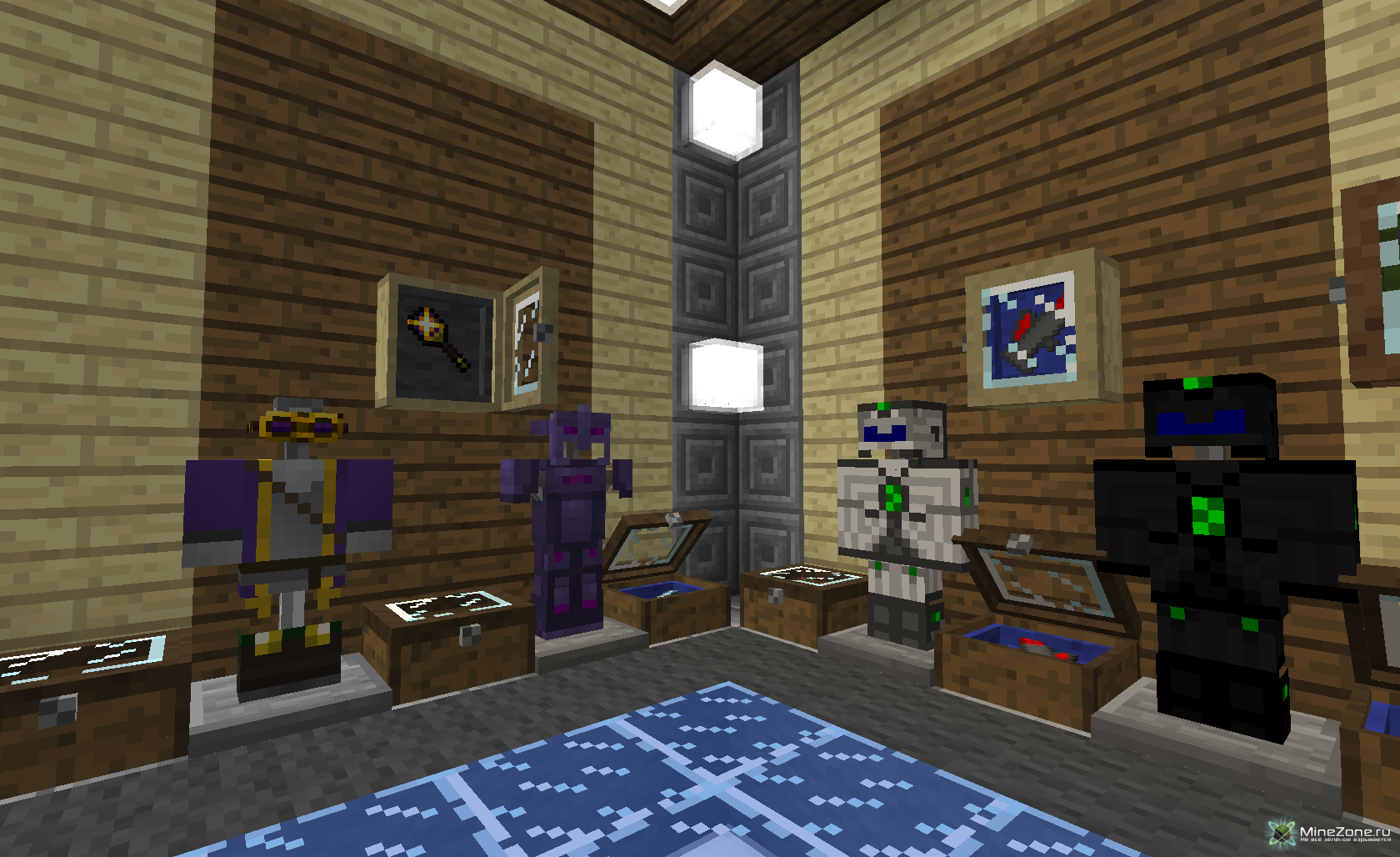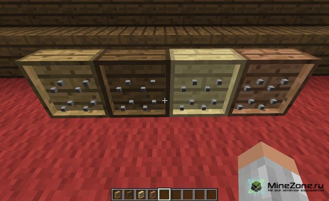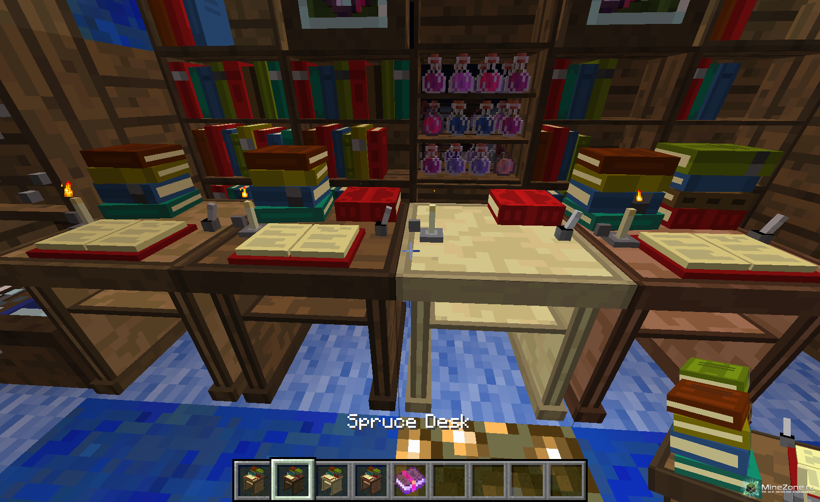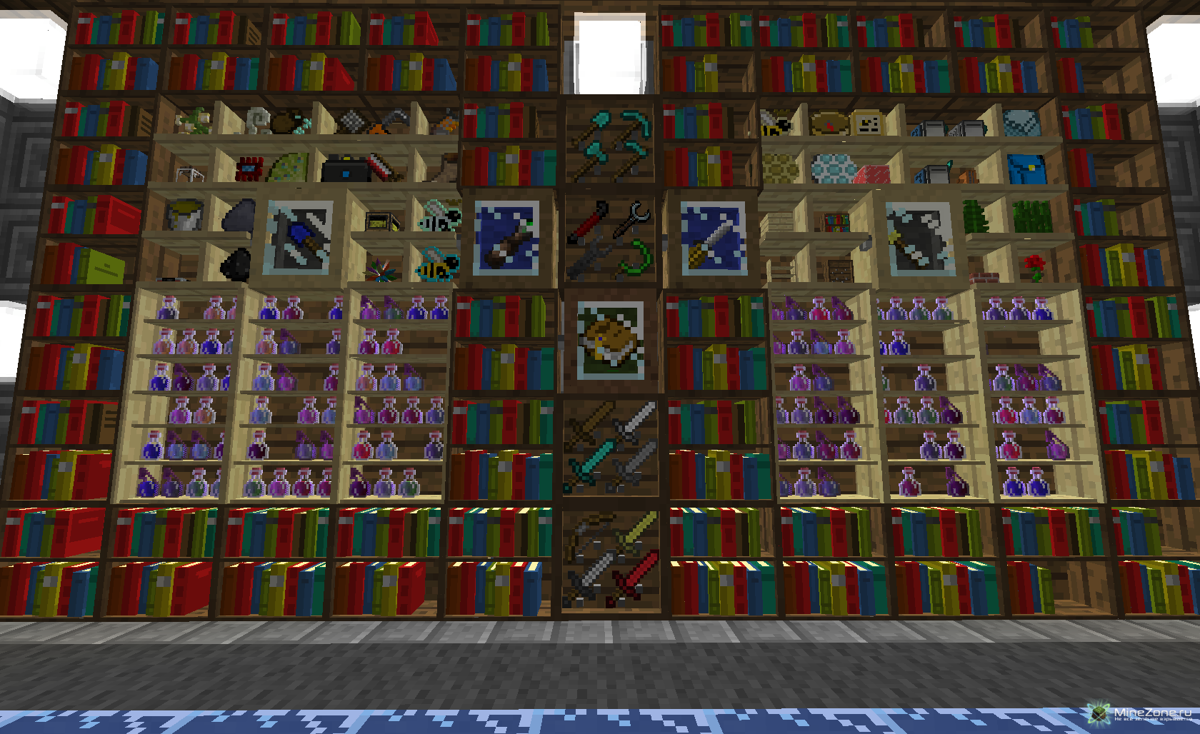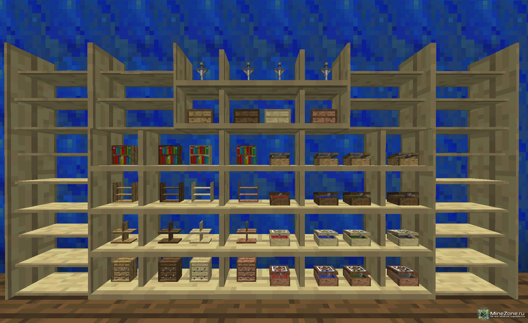 Данный мод добавит в игру 8 новых видов блоков, отображающих различные элементы. Так например, книжный шкаф сможет отображать до 16 книг на полке; вешалка сможет отображать полный сет брони; полка для зелий сможет вместить в себя до 12 склянок; стойка для инструментов позволит разместить до 4 орудий; витрина сможет вместить в себя лишь один предмет, подчеркивающий аристократичность владельца; ярлычки позволят отображать до 3 предметов, сделано это с той целью, чтобы Вы более никогда не возились в сундуках, вспоминая что где лежит. Письменный стол создан для того, чтобы Вы смогли поместить туда свой недописанный роман или дневник. Щелчок правой кнопкой мыши, держа при этом книгу в руке, заставит переместиться книжку на стол. Shift + ПКМ - вернуть книжку обратно. Рулетка позволит измерить расстояние от блока до блока. ПКМ - выбрать точку начала измерений, ПКМ по другому блоку - устанавливает конечную длину отрезка.