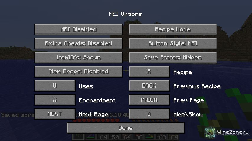 РецептыФункция "рецепты" включает в себя два режима: рецепты и применения. Нажатия клавиш R или U переключат Вас в эти режимы. Также будут отображаться не только стандартные рецепты крафта или описания вещей, а крафты и описания вещей из модов, установленных Вами.