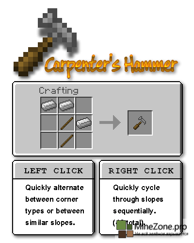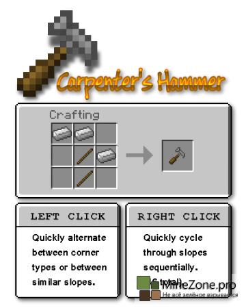 Carpenter`s Slope — проще говоря, на русский название мода переводится как «Ступенька плотника». Как вы уже догадались, этот мод добавляет ступеньки в Minecraft. Но здесь нет ни огромного количества крафтов, ни сложных рецептов. А есть только один новый блок, который сможет заменить их все!