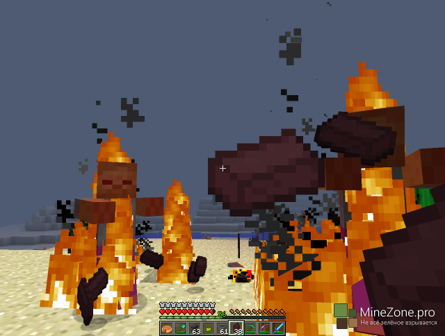 - При попадании в цель, адский кирпич подожжет блок или моба;