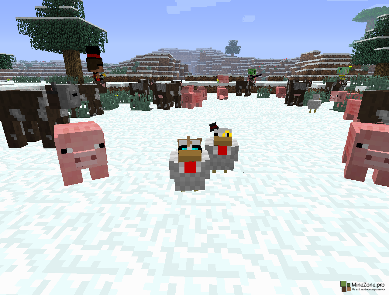 Мод добавляет шапки разных цветов и размеров, оригинальные, креативные, символические. Чтобы заполучить хоть одну из них нужно за неё побороться. "С кем?" спросите вы, а я отвечу "С мобами!". На курах, свиньях, коровах, на зомби, на овцах сможете увидеть шапки путешествия по огромному миру Minecraft'а. Поподробнее вы узнаете ниже.