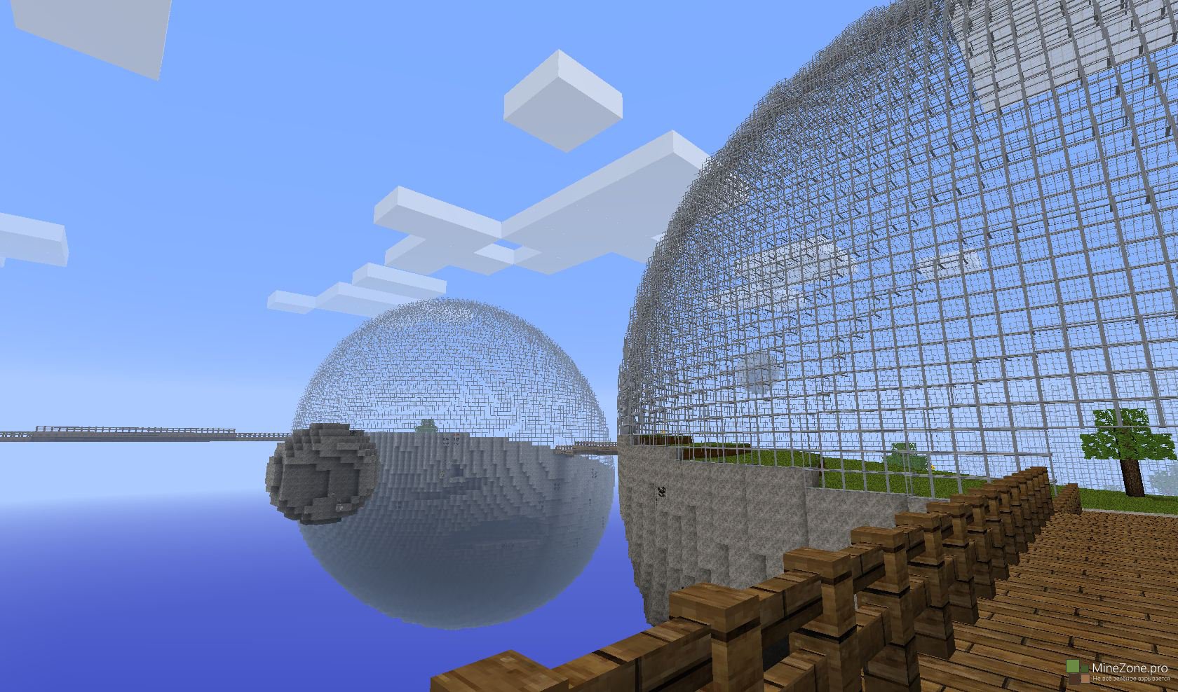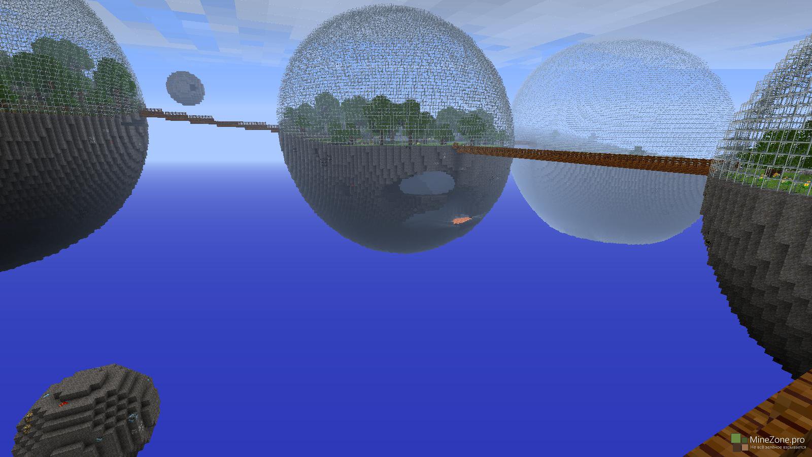 Модификация добавит новый тип мира - Биосферы. Чтобы его создать, нужно при создании мира в меню "Дополнительные настройки мира", выбрать тип мира "Biospheres" и создать мир. Как видно на скриншоте, мир будет состоять из сфер со стеклянным куполом, соединённых деревянными мостами. В каждой заключён один из биомов. Также иногда около сфер находятся летающие камни, наполненные ценной рудой.