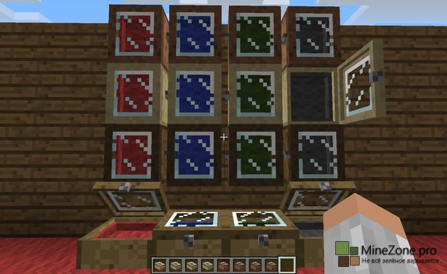 Как и книжные полки, может быть сделана из различных видов досок. Так же, при изготовлении могут быть использованы 4 вида шерсти: красный, зелёный, синий и чёрный. Витрина может размещать в себе только один предмет. Для того, чтобы открыть дверцу витрины, необходимо кликнуть по ней ПКМ с зажатым shif'oм и пустыми руками. ПКМ по открытой витрине с каким-либо предметом разместит его на витрине. ПКМ с пустыми руками по витрине откроет GUI. Если при открытии GUI в витрине уже есть какой-то предмет, то вы получите его обратно. Стоит отметить, что размещение редстоуна в витрине будет передавать энергию рядом стоящим редстоун-предметам/схемам. Так же если поместить факел в витрину, то он будет излучать свет.