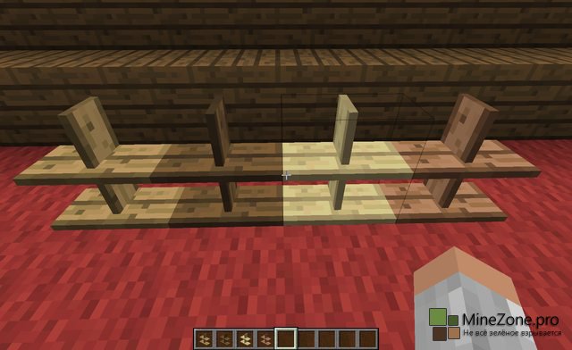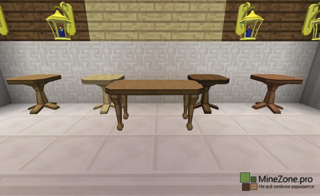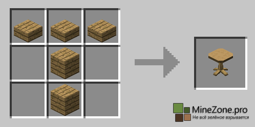 Стол может быть изготовлен из 4-х видов досок, что повлияет на его цвет. Чтобы разместить предметы на столе, необходимо кликнуть ПКМ с предметом в руке по верхней части стола. Расположенные на столе предметы можно вращать, используйте рулетку. Стол может быть неограниченного размера, если поставить, к примеру, 10 столов рядом, они все станут одним большим столом.