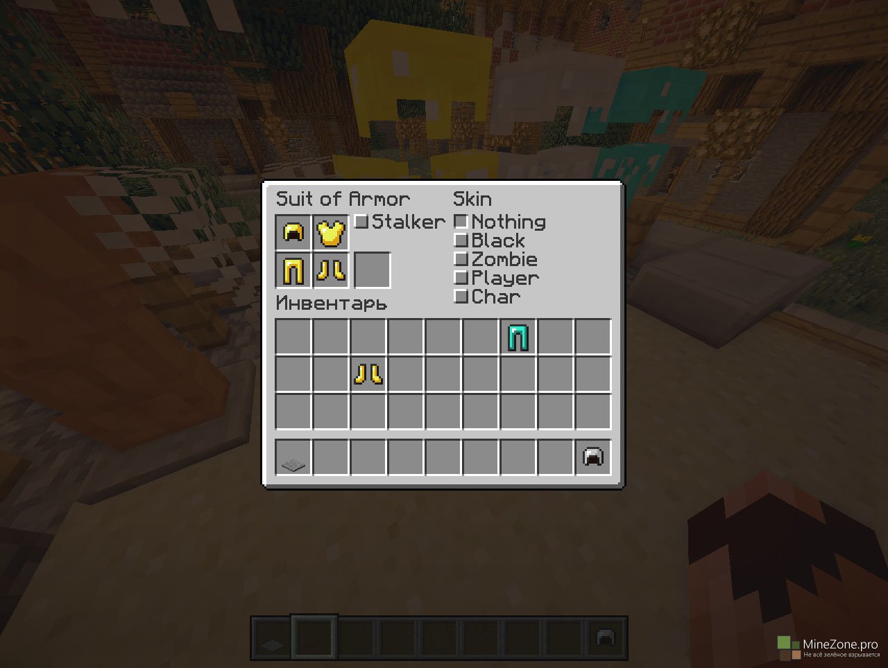 Клик ПКМ по стенду откроет GUI, которое и позволит вам разместить доспехи на стенде. Так же ваша новая вешалка имеет функцию смены внешнего вида. Вы можете выбрать вид вешалки, один из 5: прозначный, чёрный, скин зомби, скин Стива и ваш собтвенный скин. Если указать стенду параметр "Stalker", то стенд, подобно мобу, будет смотреть на вас.