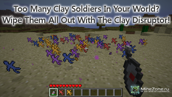 Вы можете увлечься проводя эксперименты над своими солдатами. Если вы создадите очень много солдат, они имеет привычку находить выход из боевой арены и убегать в каждый уголок вашего мира. Но теперь есть разрушитель глины, удобное маленькое устройство, сделанное из 2/3 глины, 1/6 рэдстоуна и 1/6 палки, это невероятно мощное устройство, когда оно находится в правой руке. Нажав на блестящую красную кнопку, устройство начинает излучать невероятно мощные радиоактивные волны, которые способны мгновенно уничтожить неподалеку стоящих глиняных солдат и вызвать рак в небольших бабочек. Каждый раз когда вы используете это устройство, все солдаты в радиусе 16 блоков превращаются в глиняные тосты. Использовать разрушитель можно 16 раз, после чего он разрушается и прекращает свое существование в нашей вселенной. И по каким-то таинственным причинам, это приспособление также воздействует и на глиняных лошадей. Так что если вы хотите устроить глиняный геноцид, этот инструмент то что нужно.