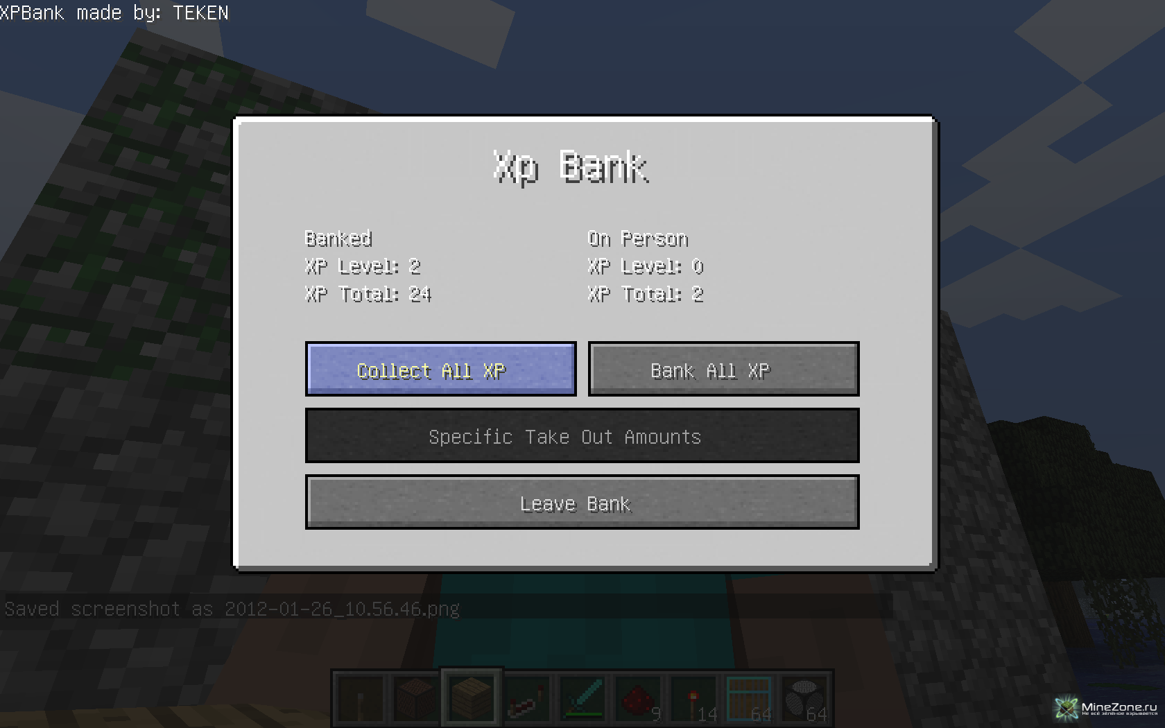 [1.1.0] XP Bank v3.1 Категория: Скачать / Моды для Minecraft Мод добавляет в игру сундук, в которым сможете хранить свой опыт, чтобы не потерять его после смертиКрафт:Вид из нутриВидеоУстановка:Кидаем все в minecraft.jarxp-bank-v3.1-1.1.0.rar [17.94 Kb] (cкачиваний: 484)