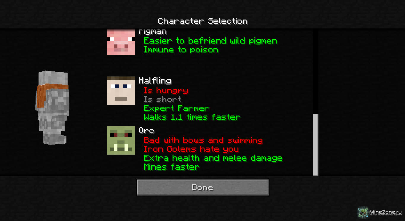 У каждой расы есть свои плюсы и минусы. Например, Halflings могут пролезать в области высотой в 1 блок(в будущем появится дверь, размером в 1 блок)