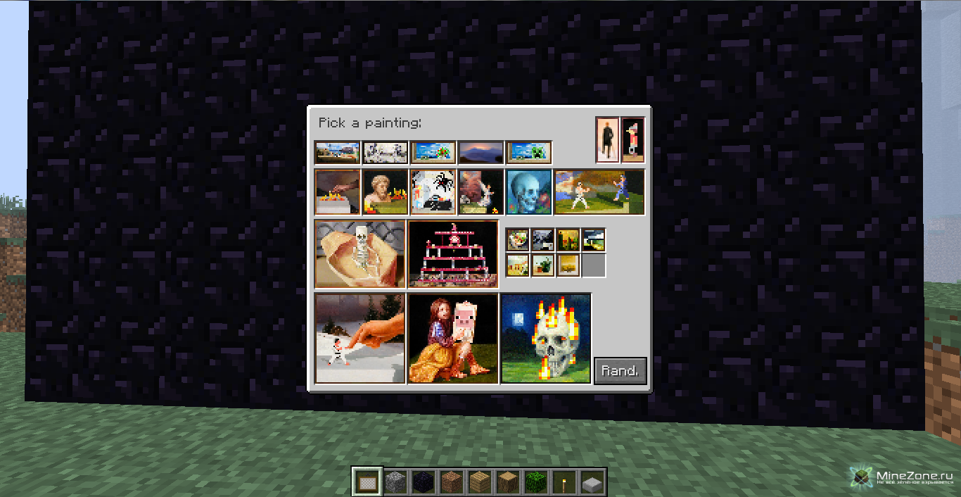 [1.2.5] PaintingPick Категория: Скачать / Моды для Minecraft Теперь, когда Вы попытаетесь повесить картину, высветится небольшое окошко, в котором будет возможно выбрать понравившуюся картину. Небольшой обзор от меняСкачать: PaintingPick.zip [12.06 Kb] (cкачиваний: 1 015)