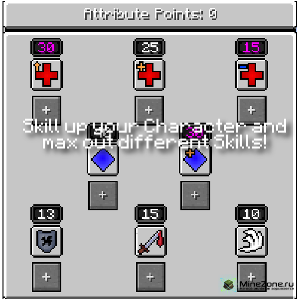 При повышении уровня вам даётся 5 очков опыта. Вы можете распределить их на 8 категорий развития.