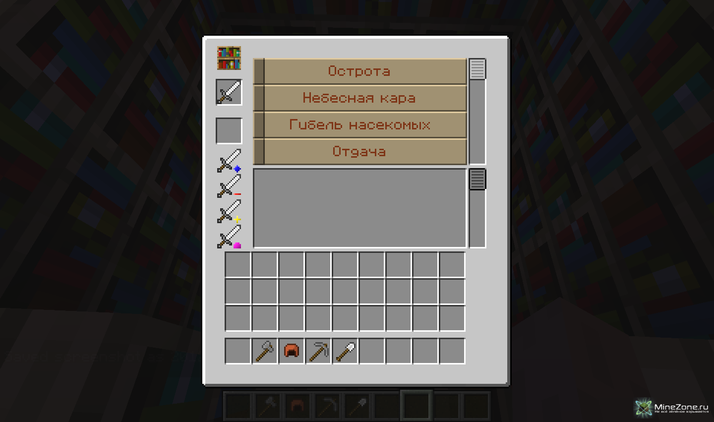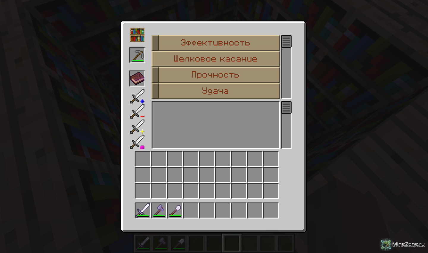 Кнопка удаления чар, если у вас стоят ненужные чары, то зайдите в стол зачарований и оставьте нужные вам чары, после нажмите на кнопку, и у вас отнимутся чары и прибавится уровень от чар.