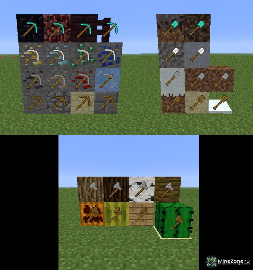 Теперь те или иные блоки придётся добывать "правильными" инструментами. Это означает то, что Вы не сможете сломать, например, блок грязи, рукой или киркой. Взаимная зависимость приведена ниже.