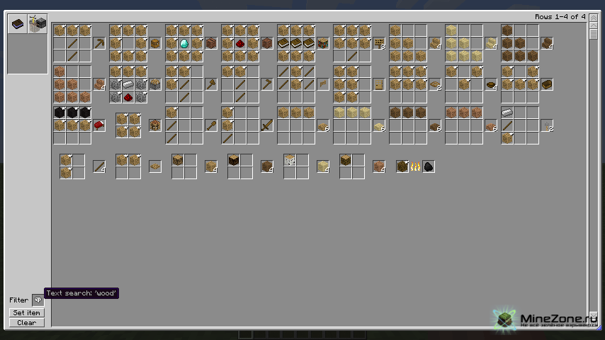 Данное окно будет иметь удобный интерфейс,а также удобное и рациональное применение.Нажав на любой предмет можно просмотреть все возможные рецепты,где этот предмет применяется.Также в нижней части окна,можно найти рецепт или нужный вам предмет с помощью поиска: