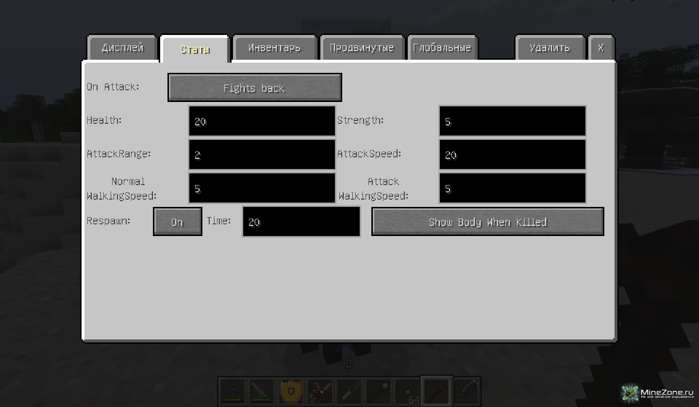 В этой вкладке ведутся настройки внешности, имени и способа передвижения NPC.