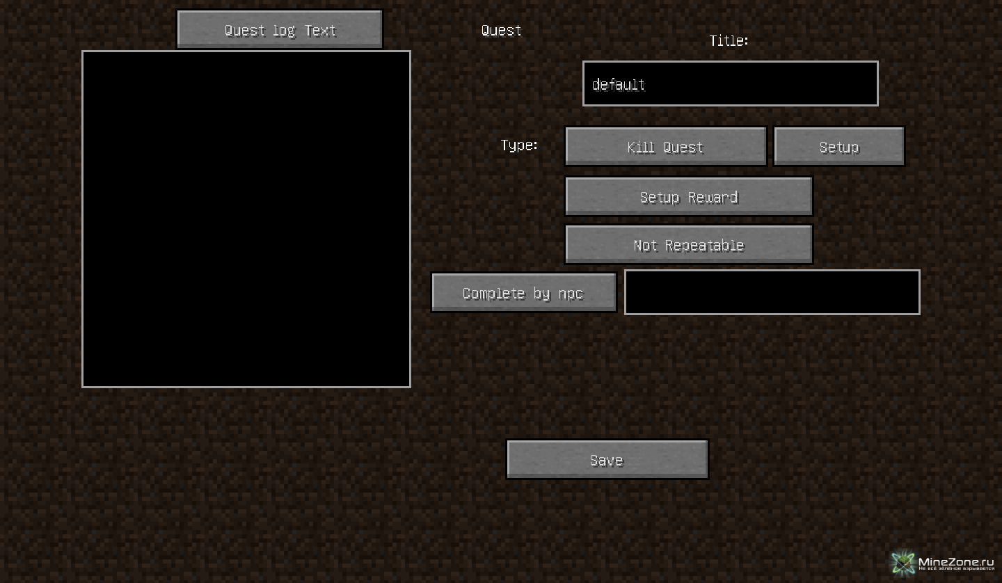 В Quest log text пишем описание квеста в журнале заданий (Открывается на букву L). При нажатии на Quest log text кнопка меняется на Completion Text, который выписывается при сдаче квеста. В title название квеста. В Complete by NPC вписываем имя NPC, которому надо сдать квест, или нажимаем на Complete by NPC и тогда тип сдачи квеста меняется на Instant complete, то есть квест будет завершаться автоматически по достижению цели. Далее выбираем тип квеста: Item quest, Dialog quest или Kill quest. Item quest требует того, чтобы игрок принёс определённый предмет, Dialog квест требует выслушать нужную реплику диалога, а Kill Quest требует убить Выбрав тип квеста нужно его настроить. Для этого нажимаем Setup и, в зависимости от типа квеста, открываеться следующее окно:
