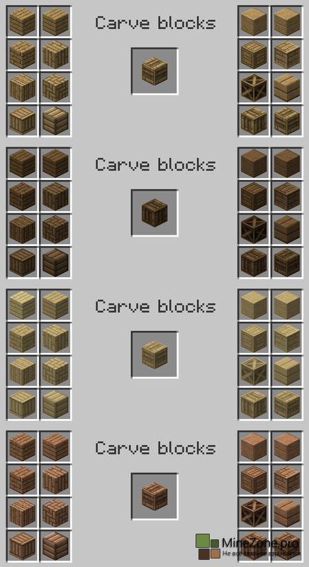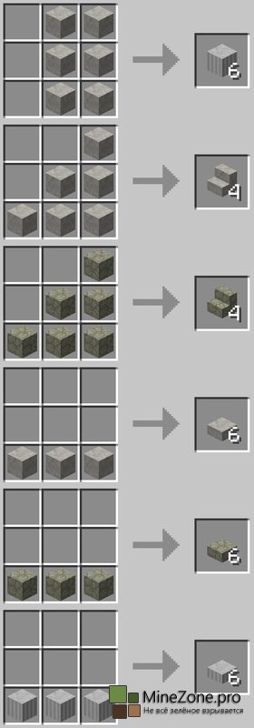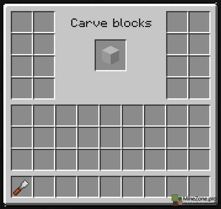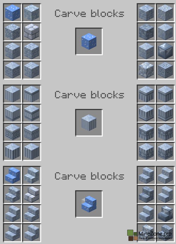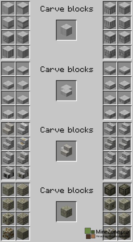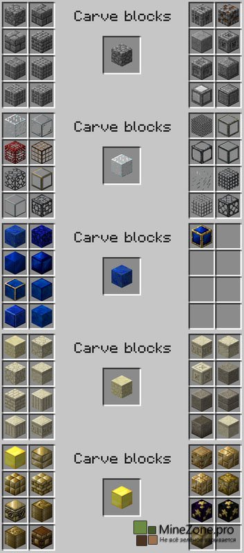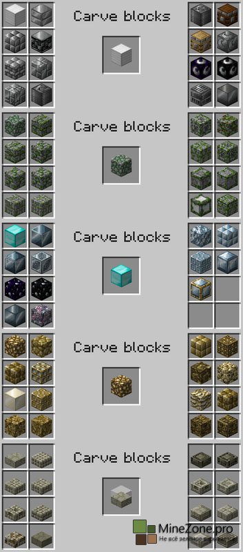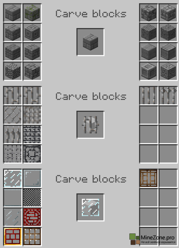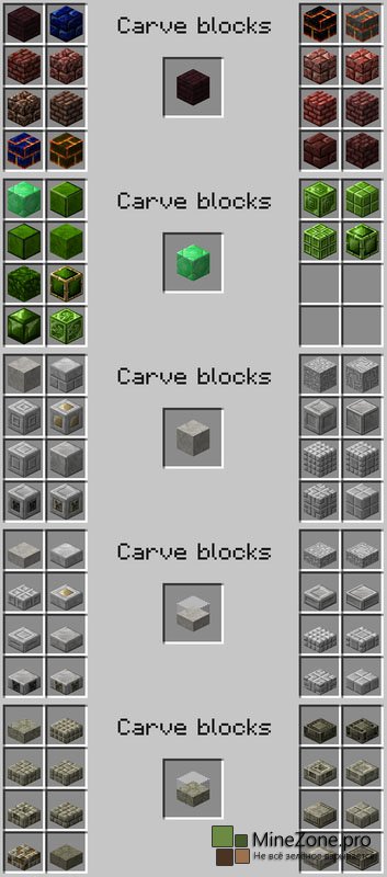 Эта менюшка и позволит нам создавать новые блоки, достаточно лишь поместить какой-нибудь блок в центральную ячейку и выбрать один из понравившихся вам блоков. Огромное кол-во декораций открывает совершенно новые возможности, теперь никакой mojang нам не указ. Блоки, поддающиеся операциям с зубилом: