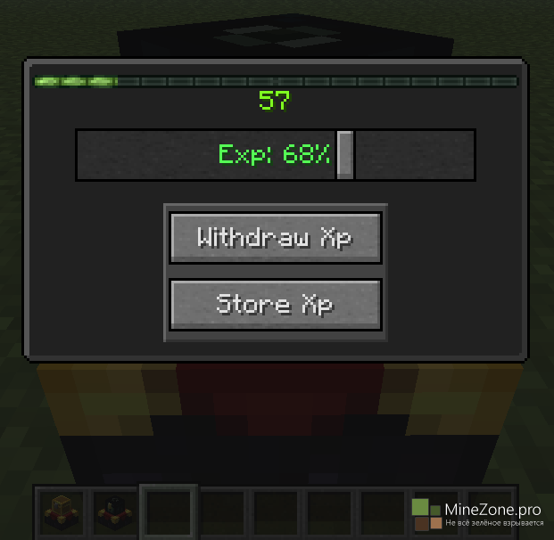 Может хранить любое количество опыта, достаточно кликнуть по нему ПКМ, затем выбрать, передвигая ползунок, сколько опыта вы хотите переместить. Чтобы сохранить ваш опыт в сундуке, кликните Store XP. Для извлечения опыта из сундука, так же указываем кол-во извлекаемого опыта, кликаем WithDraw XP. Так же имеется возможность включать/выключать индикатор уровня опыта.
