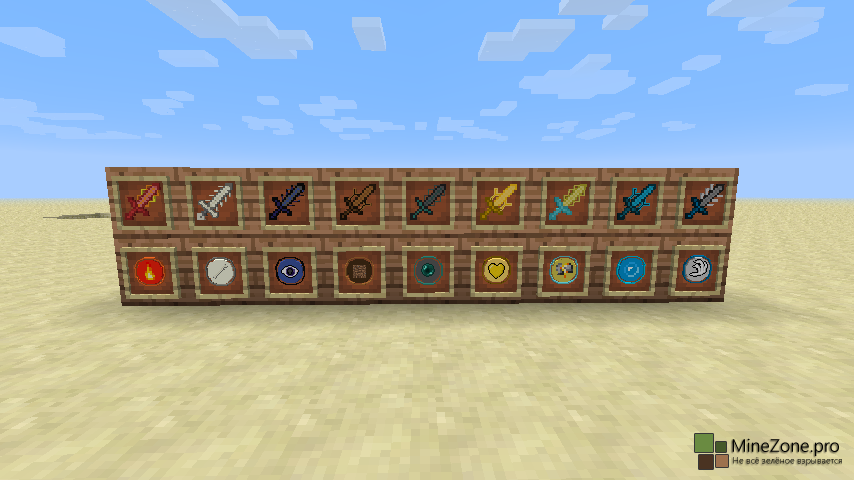 Меч данной стихии послужит вам ровно 1000 раз, при этом нанося врагам урон в 5 сердец. Совет от создателя мода: используйте данный меч только в выживании, т.к. при нажатии ПКМ вы очень высоко взлетите, использование в творческом режиме может привести к крашу. Кстати, при использовании данного оружия вы получите эффекты супер-скорости и супер-прыжка.