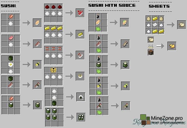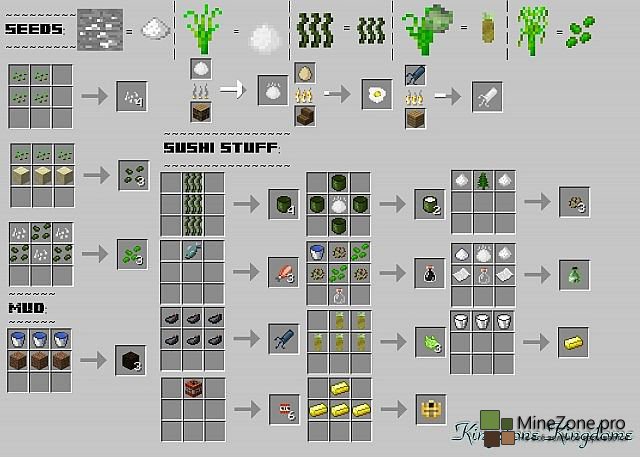 Мод просто восхитителен(Лично моё мнение). Думаю многие из нас любят суши так вот, как я сам оказываюсь любителем суши, выкладываю этот превосходный мод. Мод добавляет всё что нужно для готовки суши, от всякой зелёной живности до приборов и механизмов с редстоуном. Создай свой собственный суши-бар, накорми своих друзей! Стань настоящим поваром суши!!