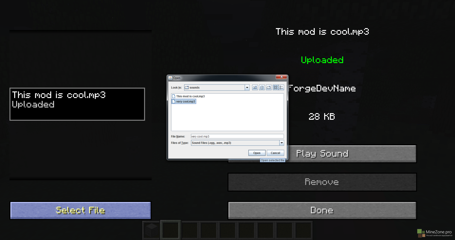 Мод "SOUNDS COOL" прост в использовании. Вы загружаете свои собственные .mp3, .wav или .ogg файлы музыки или звуков. Когда файлы загружены, все могут услышать эти звуки!