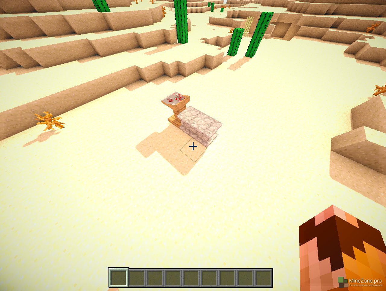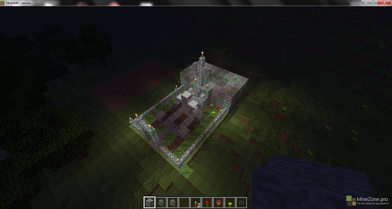 С помощью стола некроманта мы будем создавать свою армию. Создание Стола некроманта состоит из двух шагов. Во-первых, размещаем на земле 2 блока булыжника и доски: