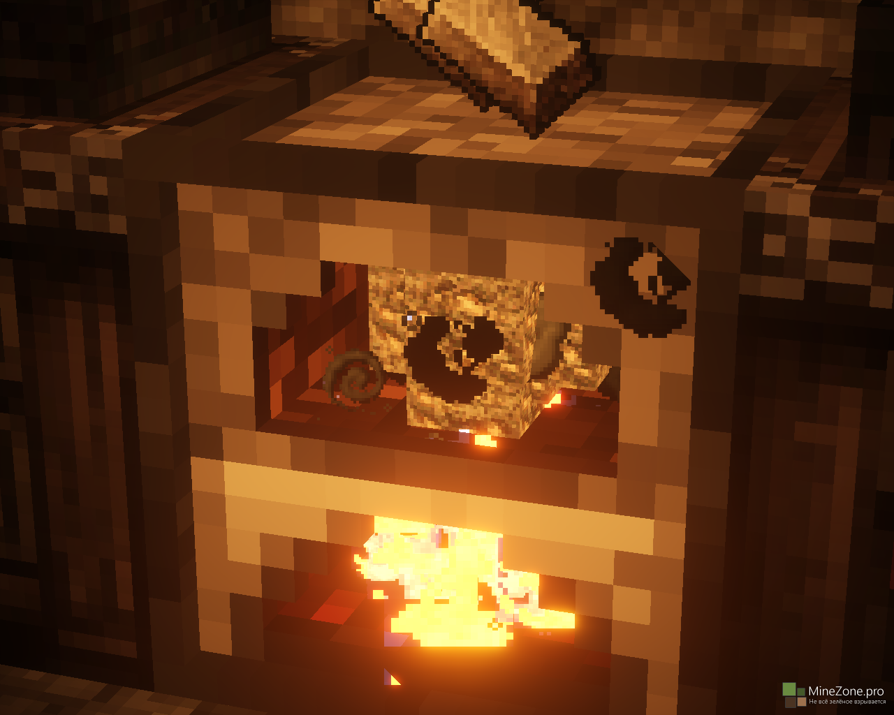 Теперь обыкновенная печь станет более... объёмней. Вы сможете видеть, что происходит внутри печки, какие предметы плавятся и какой материал используется в качестве топлива. После переплавки предмета, вы сможете увидеть его на печи. Красиво, просто, удобно