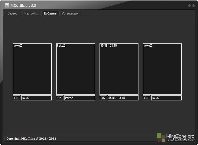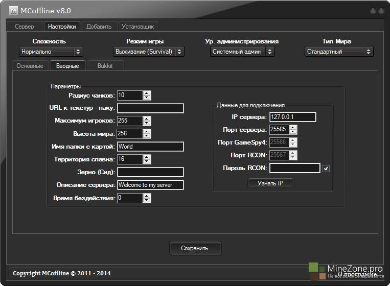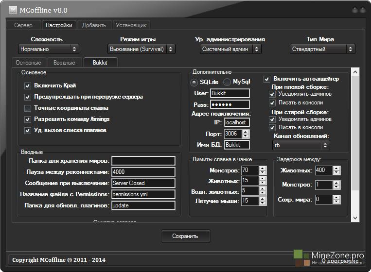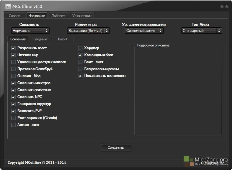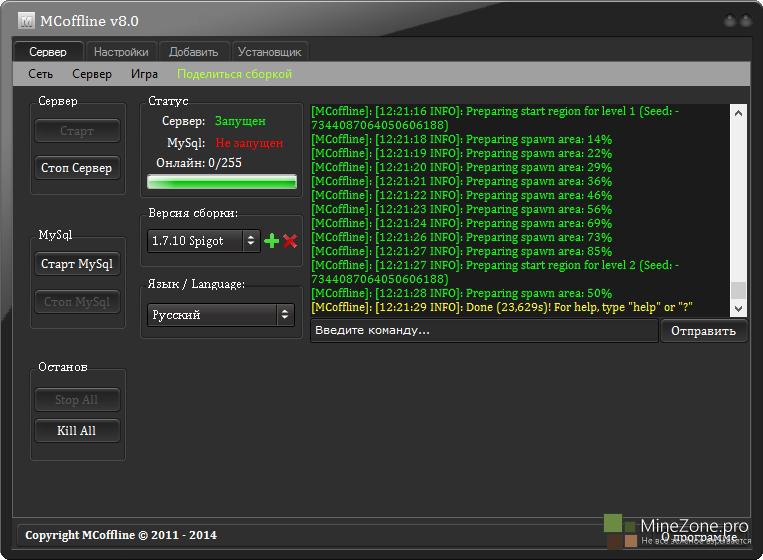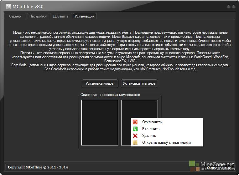 MCoffline - самая первая программа для создания, настройки, редактирования и запуска сервера Minecraft. При помощи данной программы Вы можете создавать абсолютно любые сервера - начиная с Vanilla и заканчивая Spigot. Программа может управлять модами, плагинами, а также устанавливать их на сервер без лишних манипуляций. Каждый параметр в программе оснащён подсказками, таким образом Вам будет легче понять, для чего нужен каждый из них. Так же в программе теперь присутствует полностью на русском настройка Bukkit и Spigot. В программе реализовано удаленное управление сервером, а так же, проброс (открытие) сетевых портов.