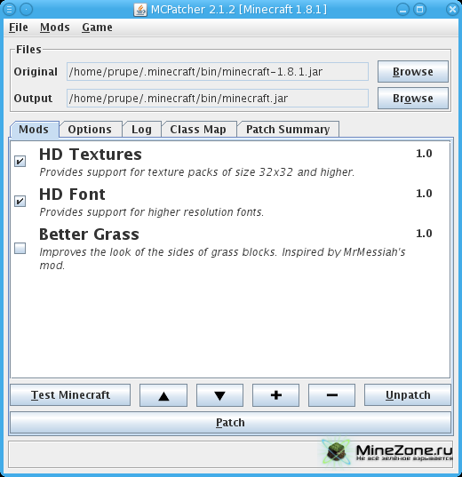 [1.8.1/1.9pre4] MCPatcher HD 2.1.2 Категория: Скачать / Программы Использование:1. Ставим везде галочки кроме Better Glass.2. Нажмимаем Patch.3. "Кидаем" текстуры в папку текстур паков.4. В игре выбираем текстуры.Скачать: mcpatcher-2.1.2.exe [1.02 Mb] (cкачиваний: 839)