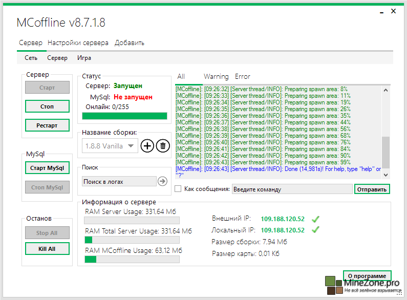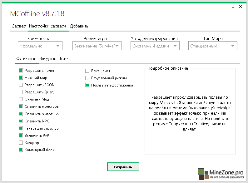 MCoffline - самая первая программа для создания, настройки, редактирования и запуска сервера Minecraft. При помощи данной программы Вы можете создавать абсолютно любые сервера - начиная с Vanilla и заканчивая Spigot. Программа может управлять модами, плагинами, а также устанавливать их на сервер без лишних манипуляций. Каждый параметр в программе оснащён подсказками, таким образом Вам будет легче понять, для чего нужен каждый из них. Так же в программе теперь присутствует полностью на русском настройка Bukkit. В программе реализовано удаленное управление сервером, а так же, проброс (открытие) сетевых портов.