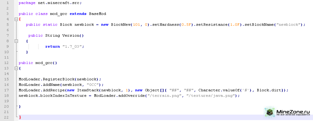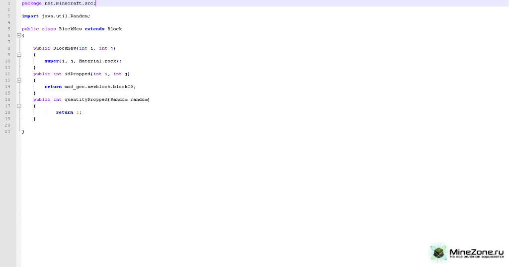 public int idDropped(int i, int j) { return mod_gcc.newblock.blockID; } public int quantityDropped(Random random) { return 1; }}сохраняем файл как java