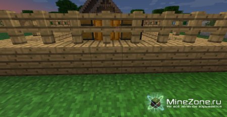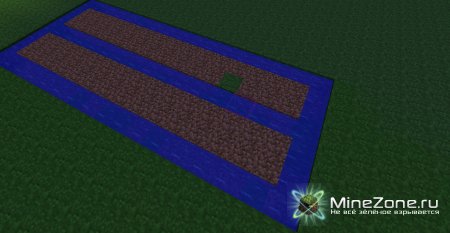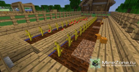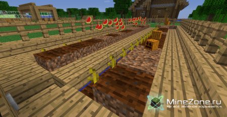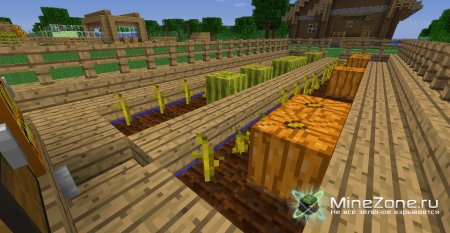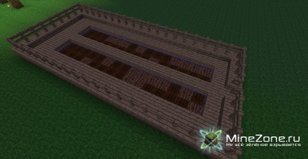 Накроем воду полублоками и садим тыквы и арбузы. С дальней стороны делаем дорожку на 1 блок шире и огораживаем грядки забором.