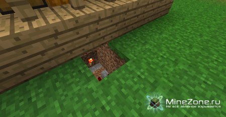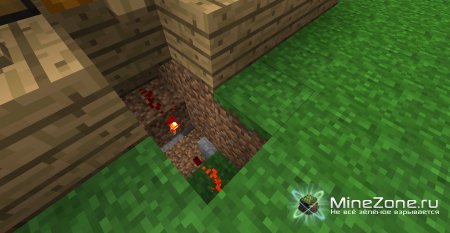 С задней стороны выкапываем яму 1х1 и 4 блока глубиной. Под блоком с кнопкой ставим красную пыль и проводим энергию вниз.