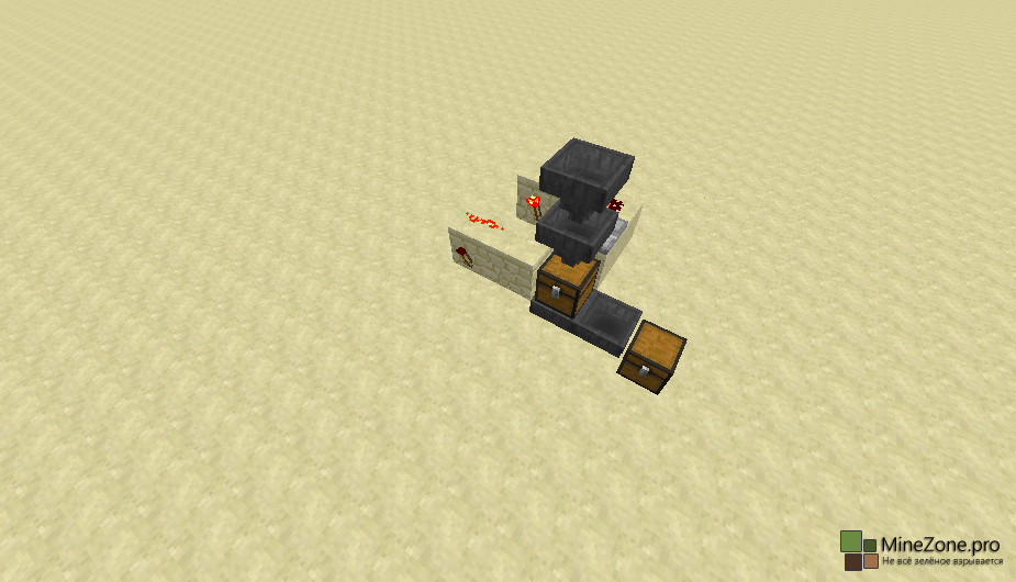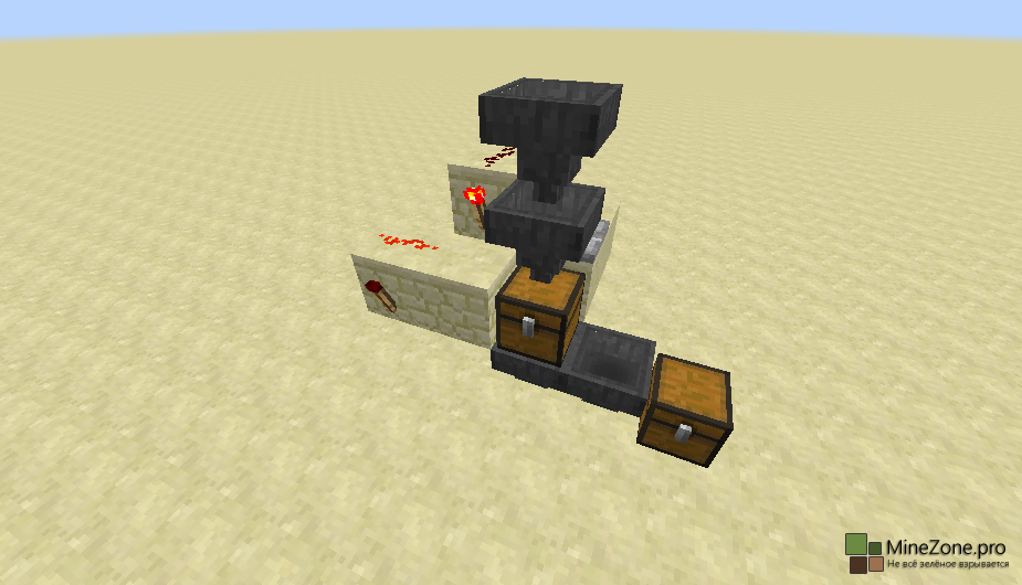 Теперь проверьте, если вы положите в самую верхние воронку правильный предмет, он пройдёт в конечный сундук, а красный факел загорится ,а не тот предмет просто не уйдёт с воронки.