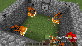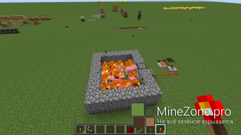 Автоматическая станция приготовления еды: постройте коробку без крыши, по углам расставьте адские камни, подожгите их, а затем поставьте раздатчик, загрузив в него яйца призывания и подсоедините к нему тактовый генератор. За минуту - полтора стака готовой еды!