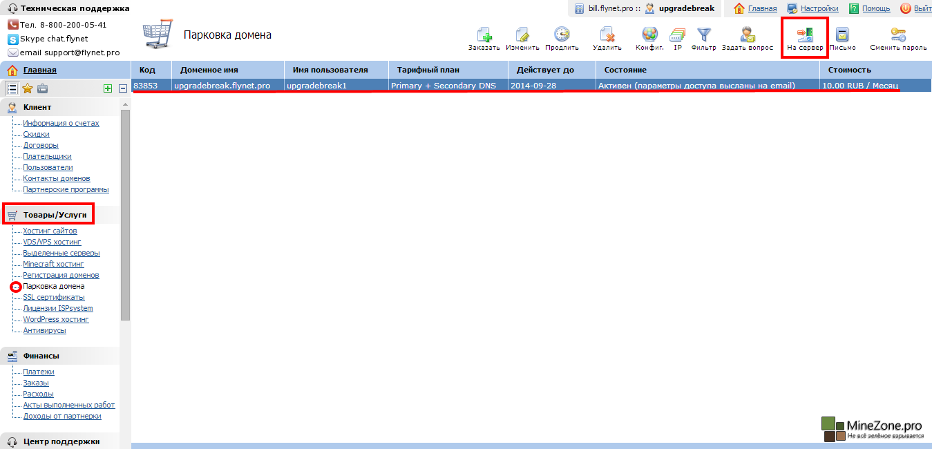 4. Далее, заказав, парковку, Вам нужно перейти в панель управления. Это можно сделать так: войдите в личный кабинет bill.flynet.pro - Товары/Услуги - Парковка домена - щелкаете на услугу - кнопка На сервер.