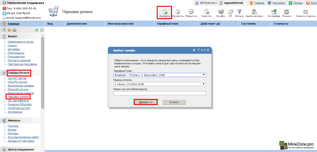 3. Купив домен у нас или в любом другом месте Вам, нужно заказать у нас услугу Парковка домена, ее стоимость составляет 10 рублей в месяц. Сделать это можно в личном кабинете bill.flynet.pro - Товары/Услуги - Парковка домена.